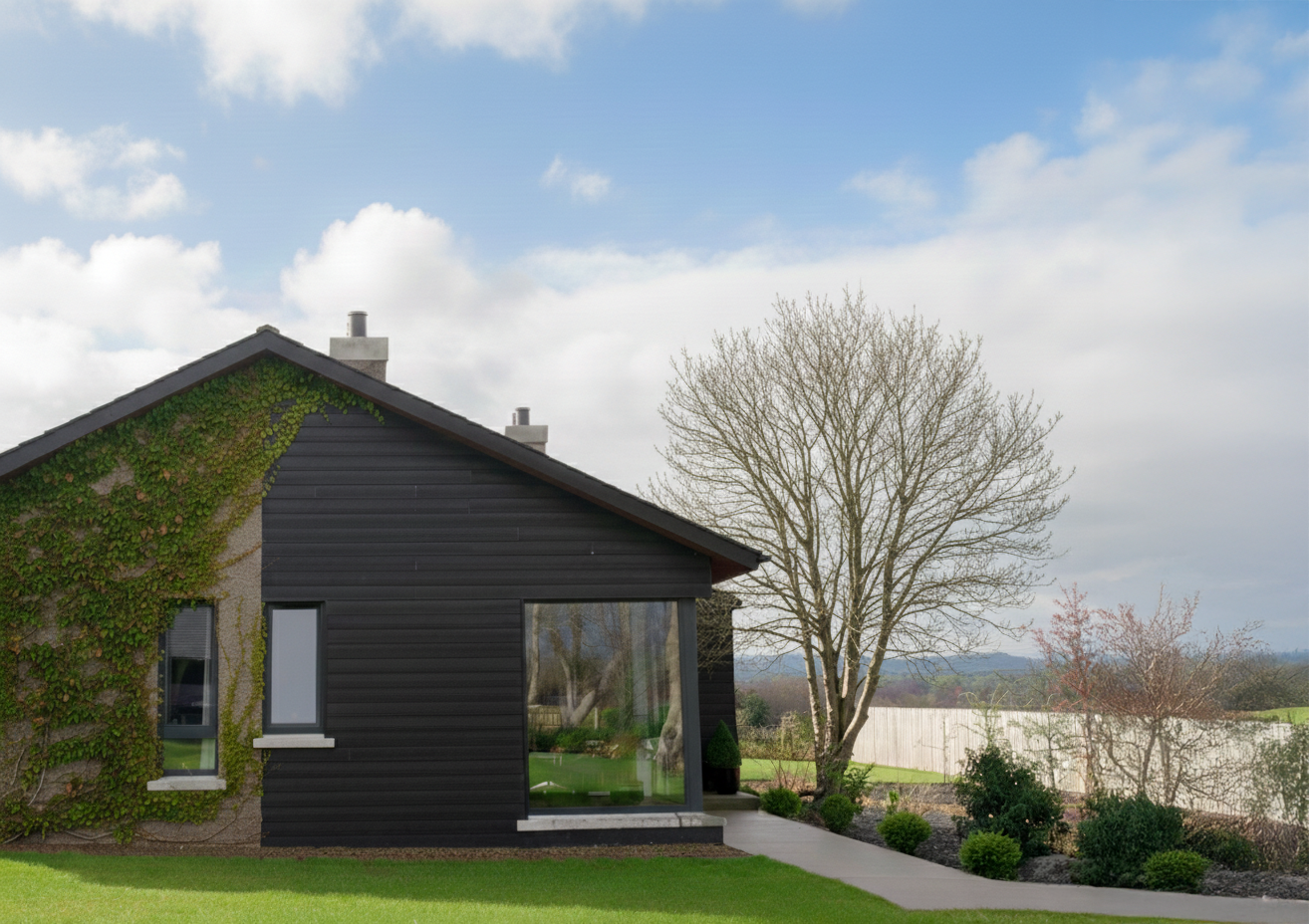 This 1,800 sq ft single-storey rural home blends contemporary design with subtle mid-century modern influences. Designed for a small countryside site, the house uses timber cladding, textured render, and generous roof overhangs to sit comfortably within the landscape. Internally, high ceilings and large glazed openings maximise natural light and views, creating a calm, well-connected living environment.